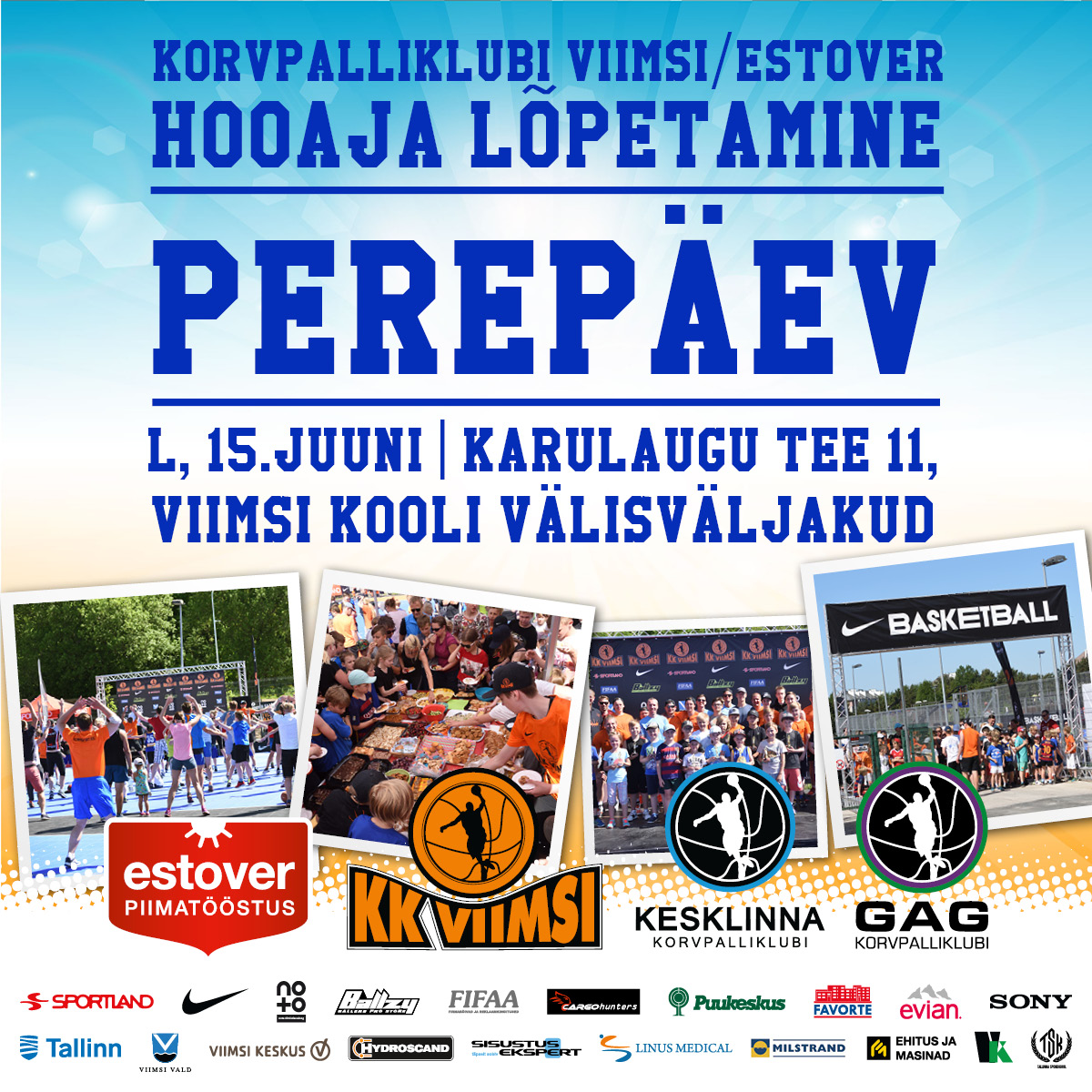 Korvpalliklubi Viimsi/Estover, sh KK Viimsi, Kesklinna KK ja GAG Korvpalliklubi 17. hooaja sportlik lõpetamine toimub laupäeval, 15.juunil Viimsi Kooli välisväljakutel ja Karulaugu Spordikeskuses, ühise Perepäevaga