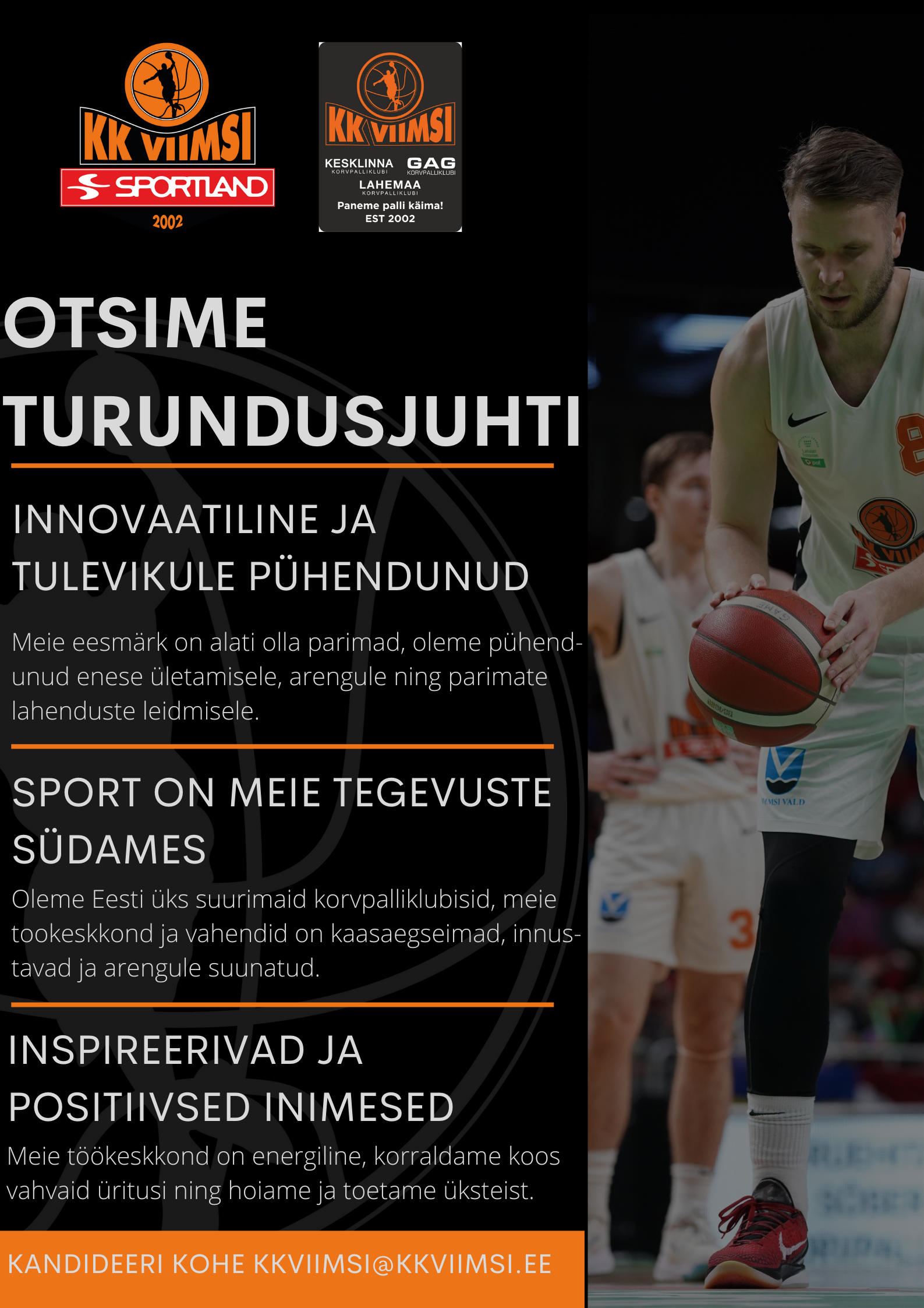 - SPORT ON MEIE TEGEVUSTE SÜDAMES: Oleme Eesti üks suurimaid korvpalliklubisid, meie töökeskkond ja vahendid on kaasaegseimad, innustavad ja arengule suunatud.