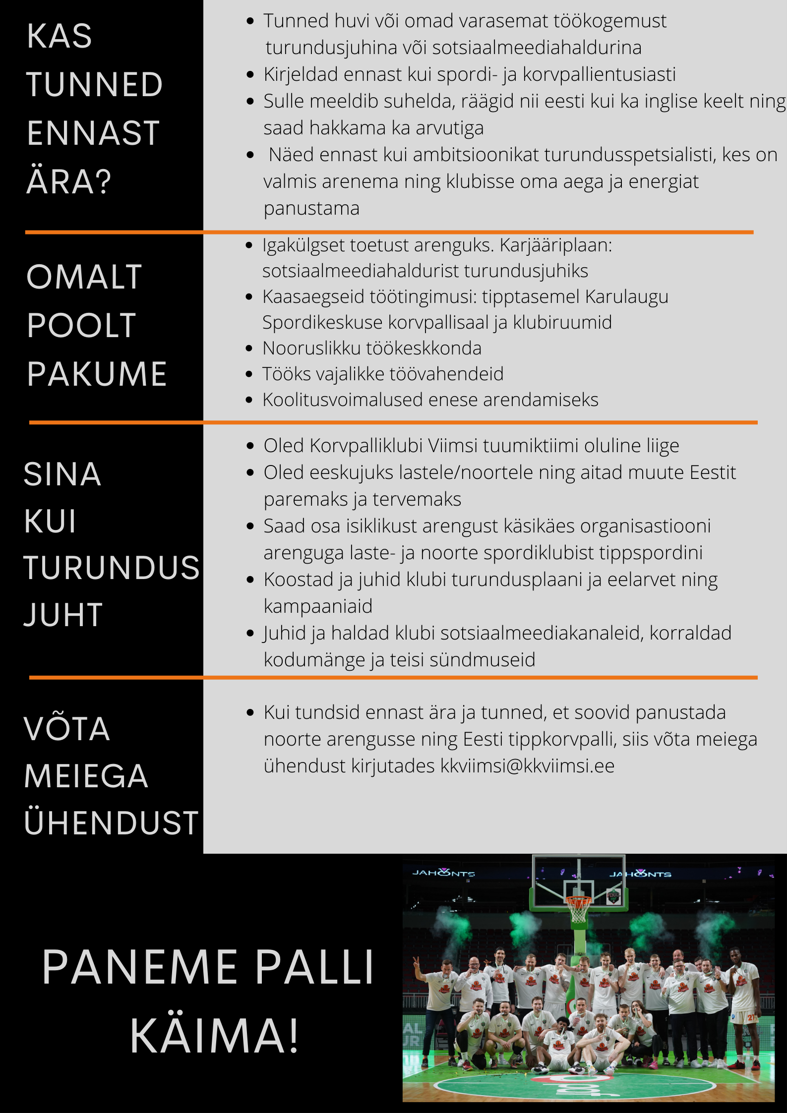 "Ootan Korvpalliklubi Viimsi energilise, üle 20 liikmelise tuumiktiimiga liituma ambitsioonikat, iseseisvat, motiveeritud ja arengule suunatud turundusjuhti või -praktikanti. Võimaldame Sulle erinevaid koolitusi ja suurepäraseid võimalusi klubisiseseks ja Sinu isiklikuks arenguks.