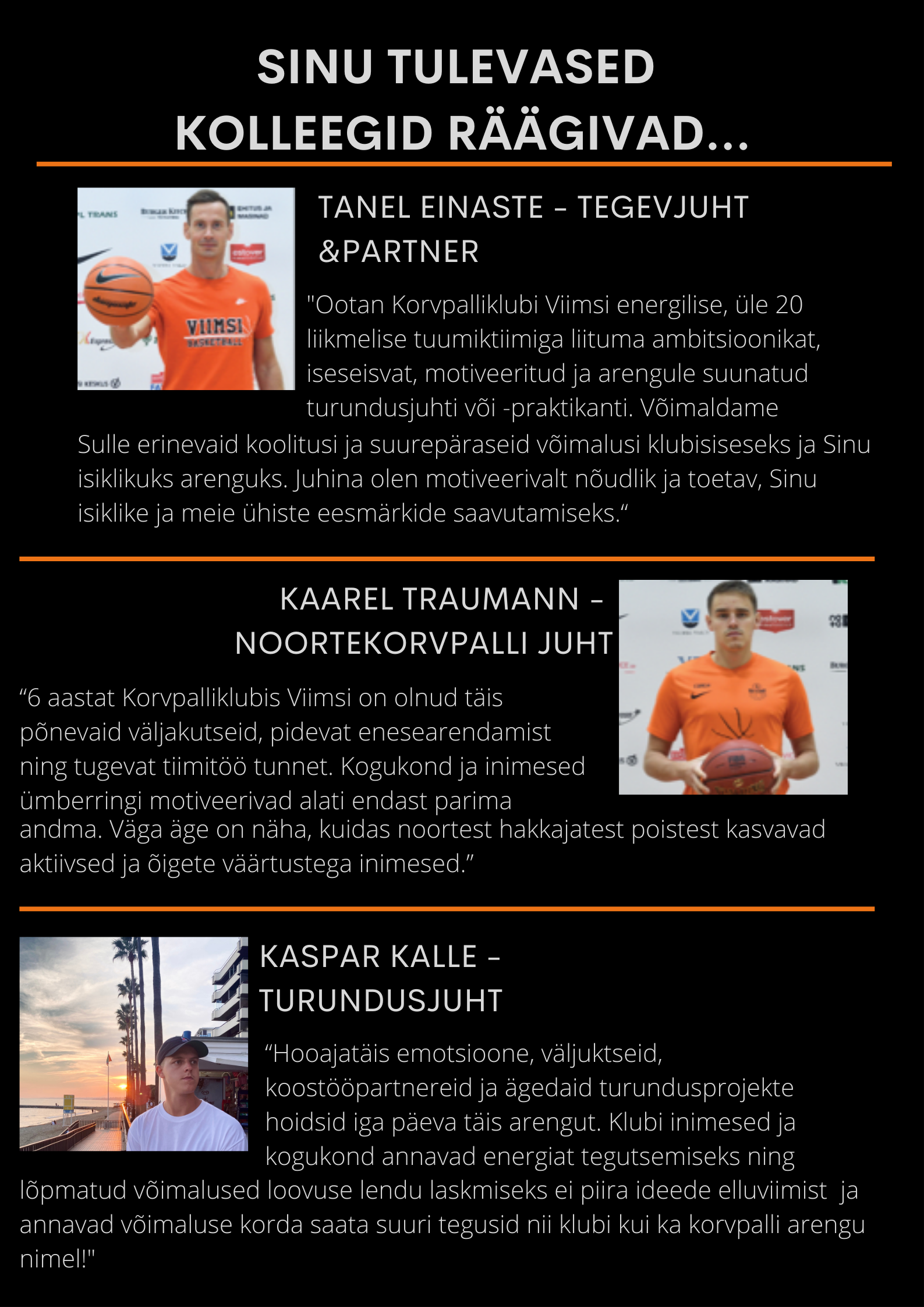 “6 aastat Korvpalliklubis Viimsi on olnud täis põnevaid väljakutseid, pidevat enesearendamist ning tugevat tiimitöö tunnet. Kogukond ja inimesed ümberringi motiveerivad alati endast parimat andma.
