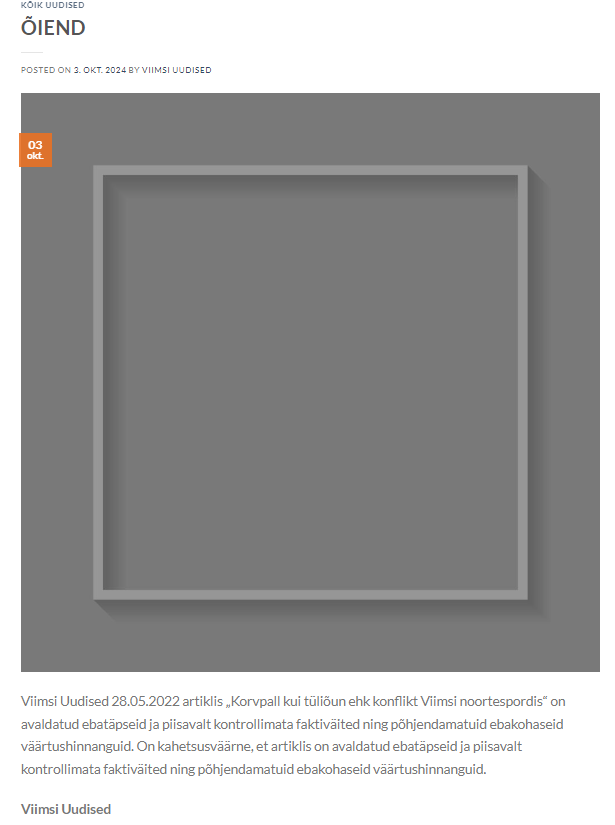 - SISU: Viimsi Uudised 28.05.2022 artiklis „Korvpall kui tüliõun ehk konflikt Viimsi noortespordis“ on avaldatud ebatäpseid ja piisavalt kontrollimata faktiväited ning põhjendamatuid ebakohaseid väärtushinnanguid. On kahetsusväärne, et artiklis on avaldatud ebatäpseid ja piisavalt kontrollimata faktiväited ning põhjendamatuid ebakohaseid väärtushinnanguid.“