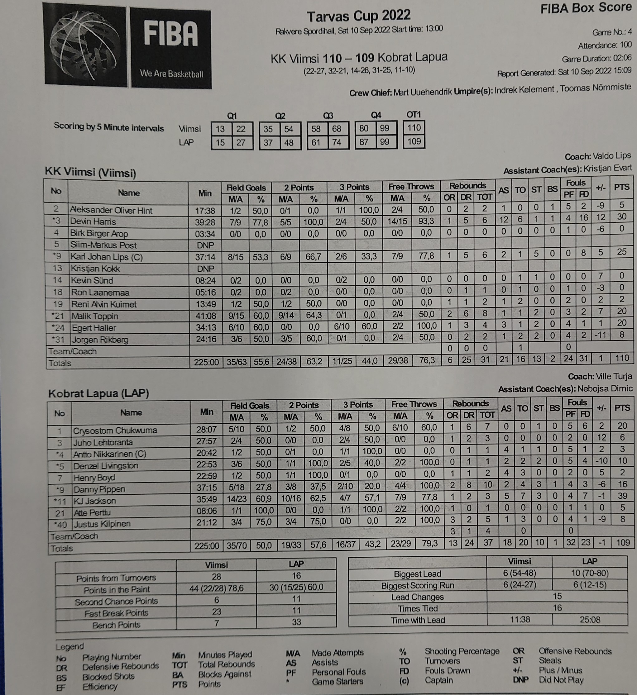 Devin Harris 30 punkti ja 12 korvisöötu. Karl Johan Lips 25 punkti. Malik Toppin 20 punkti ja 8 lauapalli. Egert Haller 20 punkti. Jorgen Rikberg 8 punkti.
