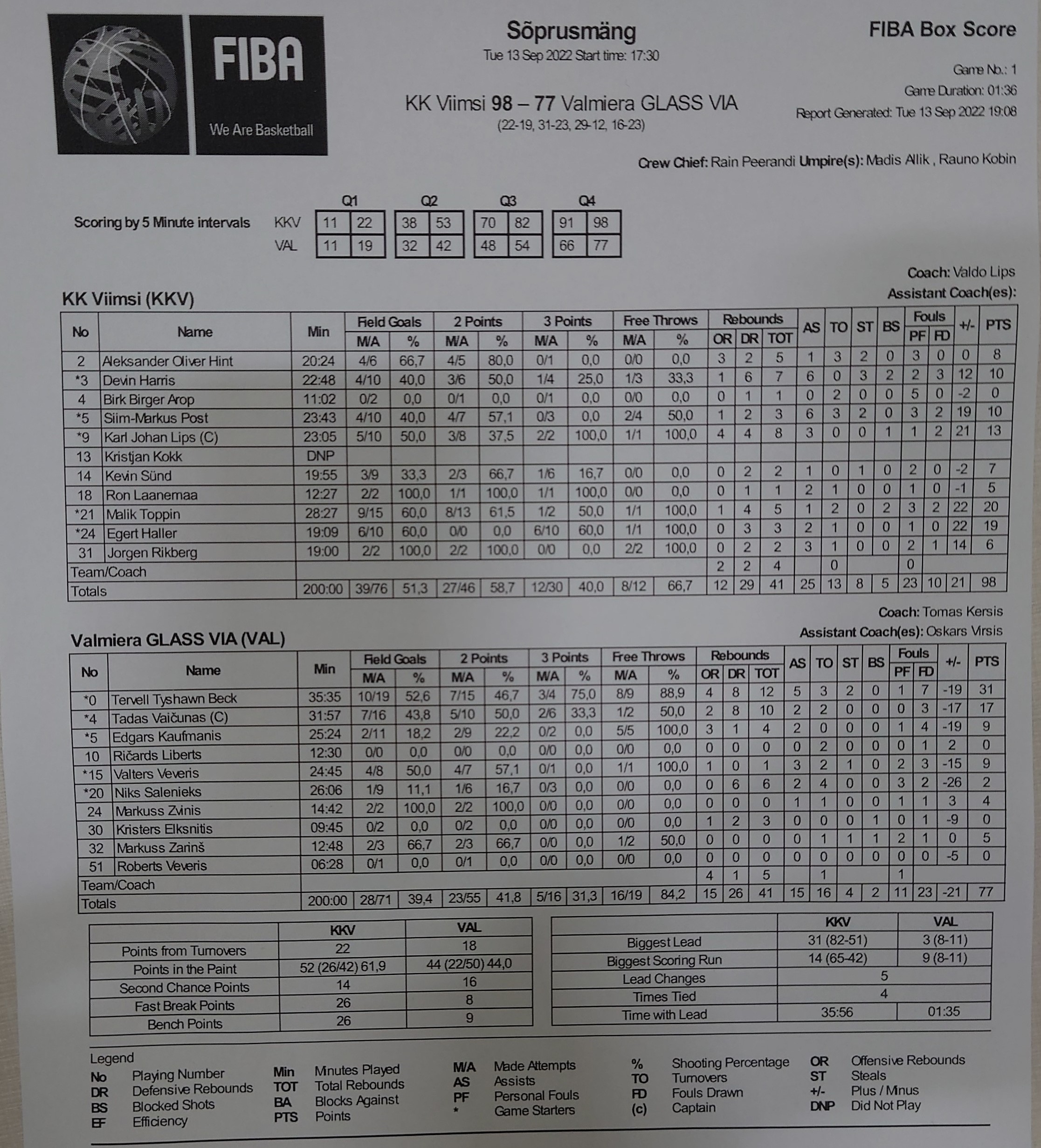KK Viimsi resultatiivsemad olid Malik Toppin 20 ja Egert Haller 19 punktiga, sealjuures tabas Haller kuus kolmest kümnest. Kahekohalise punktiskoorini jõudsid veel kapten Karl Johan Lips 13 ning Siim-Markus Post ja Devin Harris 10 punktiga. Nii Post kui Harris jagasid kumbki ka 6 resultatiivset söötu.